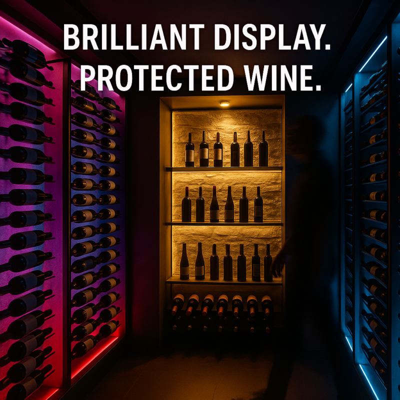 LED backlighting offers a dual advantage of enhancing visibility and protecting wines from harmful UV rays. The strategic placement of RGB+W lighting not only highlights the collection but also complements the overall design of the cellar, creating an immersive experience for anyone visiting.